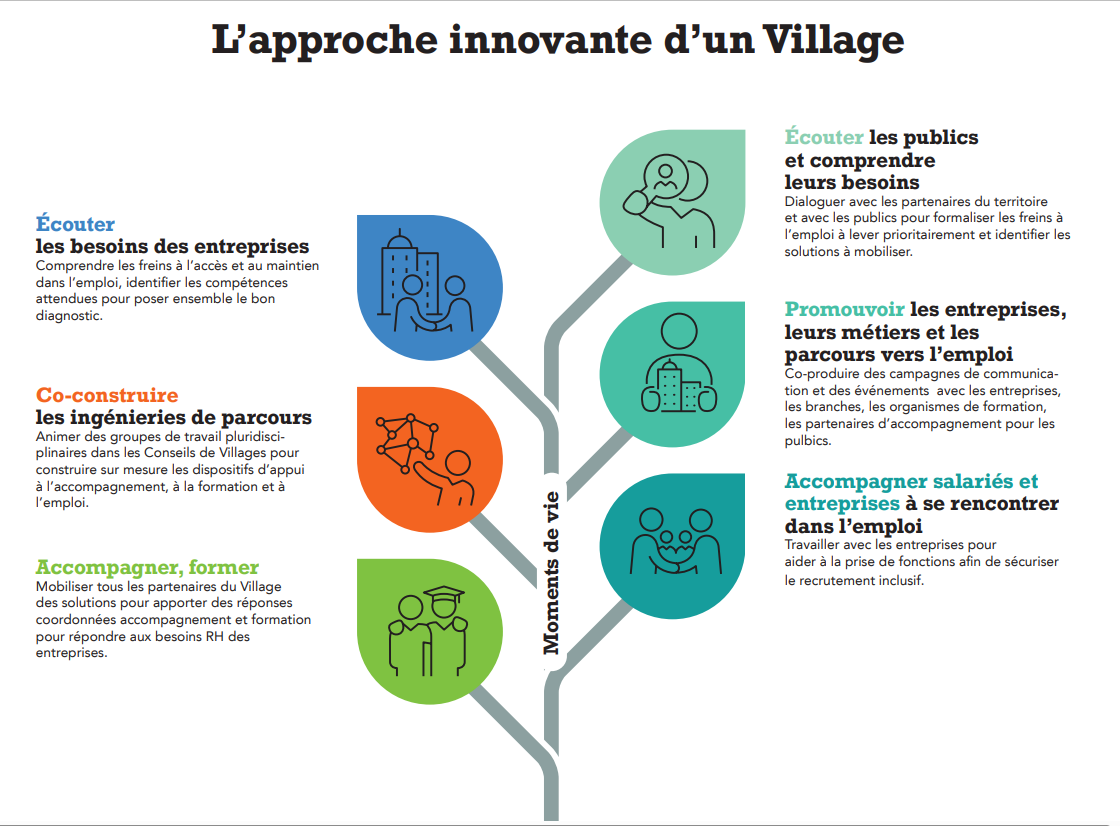 La complémentarité avec le réseau pour l’emploi : Cette stratégie et cette démarche de coopération terriroriale s’inscrivent en miroir de l’approche collaborative des acteurs du réseau pour l’emploi. Les Villages des solutions proposent des lieux d’ancrage locaux pour à la fois accélérer et renforcer ces coopérations, et accueillir tous les publics dans le cadre d’un accueil inconditionnel.
